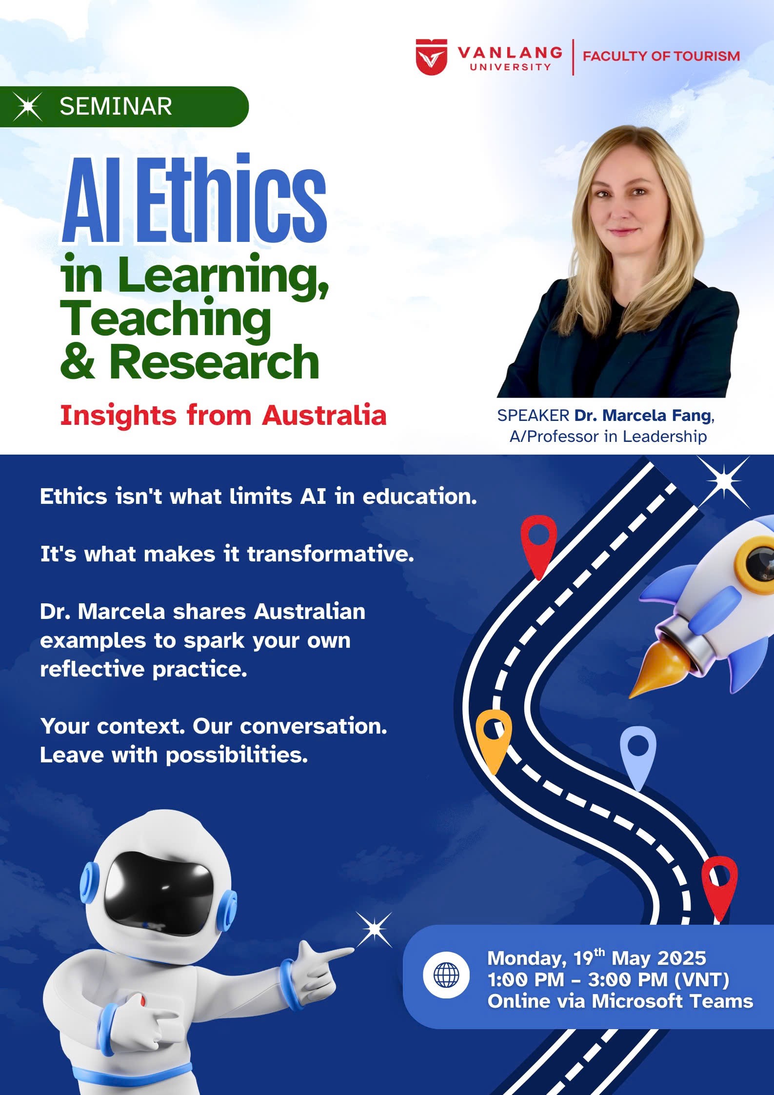 Trong kỷ nguyên của cuộc cách mạng công nghiệp 4.0, Trí tuệ nhân tạo (AI) không chỉ đóng vai trò như một công cụ hỗ trợ công nghệ, mà còn là nhân tố đang thay đổi cấu trúc và triết lý trong hệ thống giáo dục toàn cầu. Ứng dụng AI trong giảng dạy, học tập và nghiên cứu ngày càng trở nên phổ biến trong các trường đại học, song cũng đặt ra nhiều vấn đề đạo đức, quản lý và chính sách mà các nhà giáo dục cần chủ động đối mặt. Với mong muốn khơi mở một diễn đàn học thuật đa chiều, Khoa Du lịch tổ chức chuyên đề học thuật “Cách sử dụng AI có đạo đức trong học tập và giảng dạy” với diễn giả là PGS.TS. Marcela Fang đến từ William Angliss Institute, Úc.