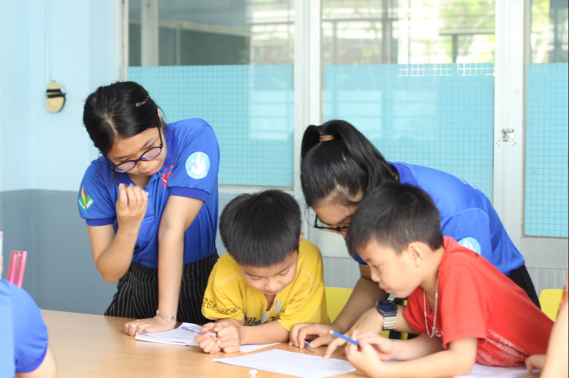 Bên cạnh đó, đội hình Gia sư Áo Xanh với 80 chiến sĩ đã mang đến cho các em thiếu nhi những tiết học bổ ích và sinh động. Không chỉ dừng lại ở giảng dạy tiếng Anh, các bạn còn kiến tạo một không gian giao lưu học thuật đa văn hóa, kết nối sinh viên Văn Lang với bạn bè quốc tế đến từ Singapore, Hong Kong và Malaysia. Chuỗi hoạt động “English Arena” với các chủ đề thời sự như: Environment, Green Tech & AI for Climate Action, Food Choices & Sustainable Living,… đã thu hút hơn 560 lượt sinh viên tham gia, góp phần lan tỏa tinh thần hội nhập và giáo dục chất lượng - hướng đến mục tiêu phát triển bền vững SDG 4.