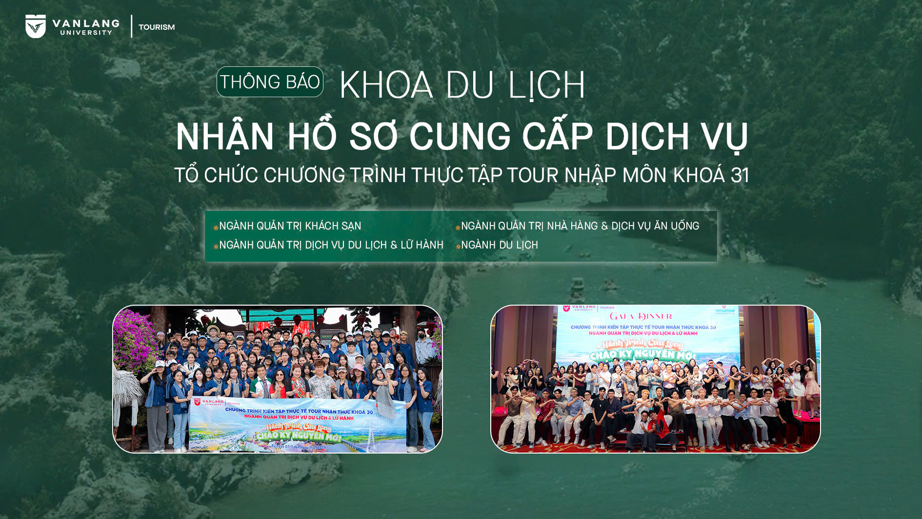 Khoa Du lịch thông báo nhận hồ sơ cung cấp dịch vụ Tour Nhập môn. Dự kiến trong khoảng thời gian từ ngày 01/04/2026 đến ngày 12/04/2026, Khoa Du lịch – Trường Đại học Văn Lang sẽ tổ chức chương trình học tập thực tế mang tên “Tour Nhập môn” dành cho sinh viên năm nhất các ngành: Quản trị Khách sạn, Quản trị Nhà hàng và Dịch vụ ăn uống, Du lịch, Quản trị Dịch vụ Du lịch và Lữ hành.