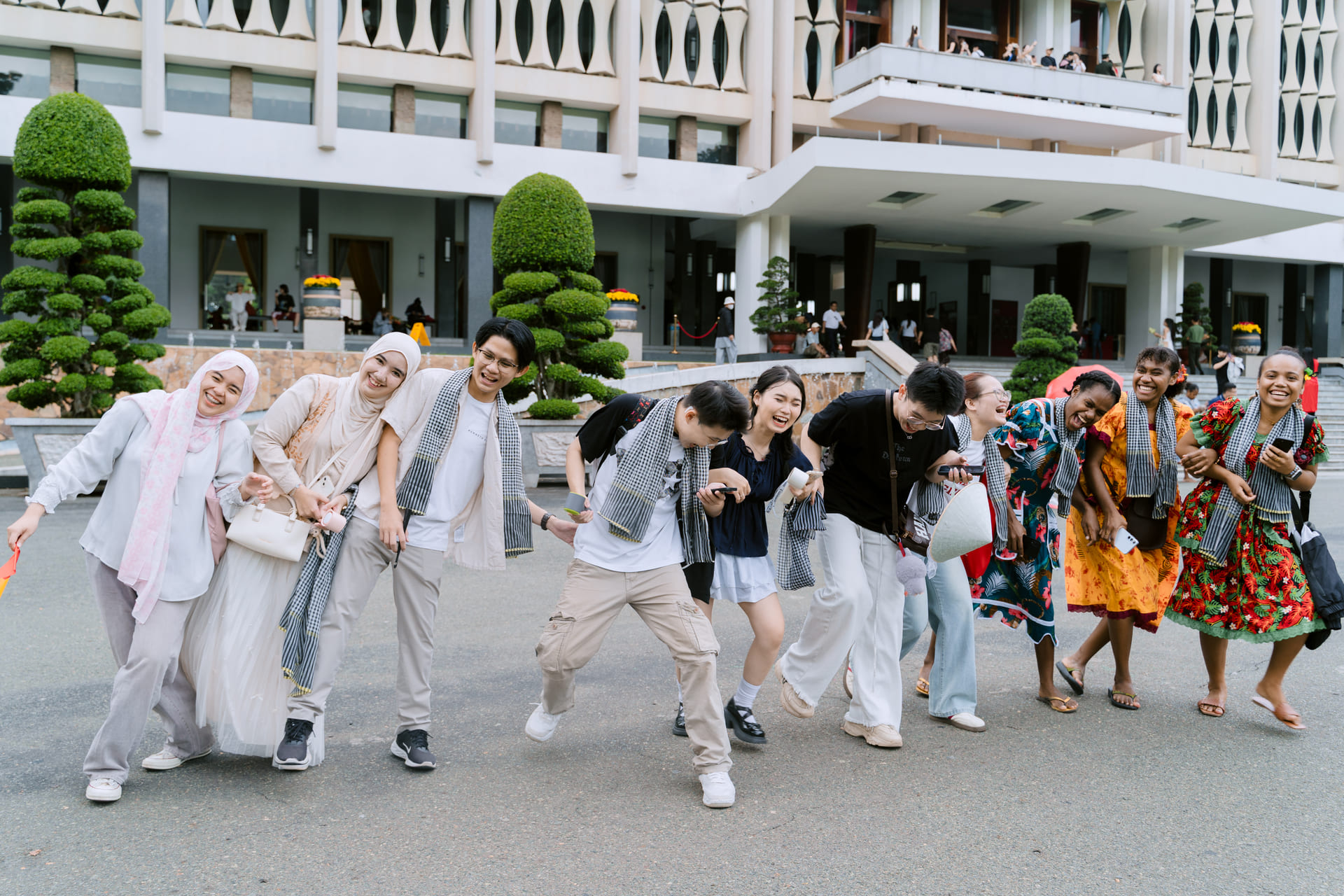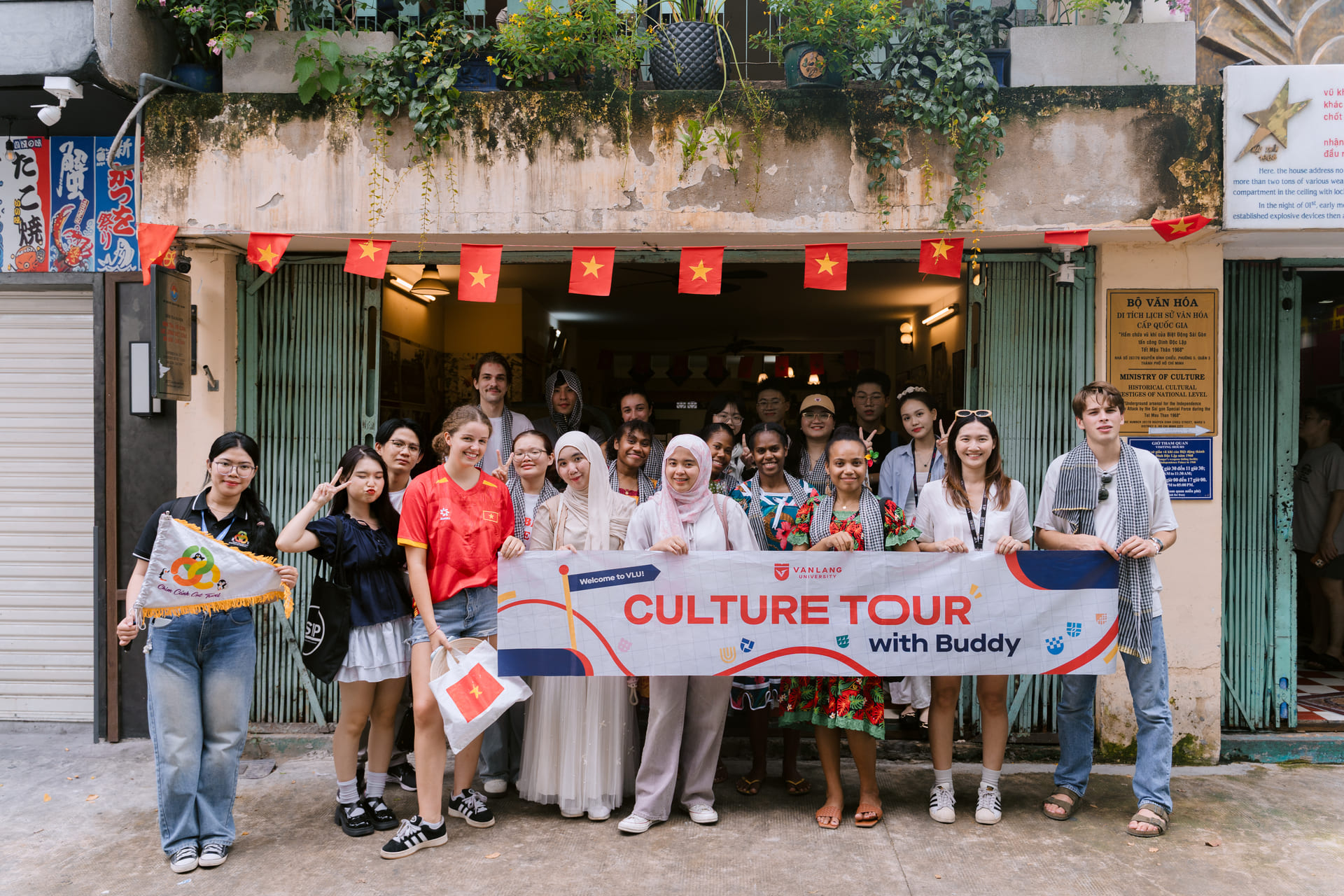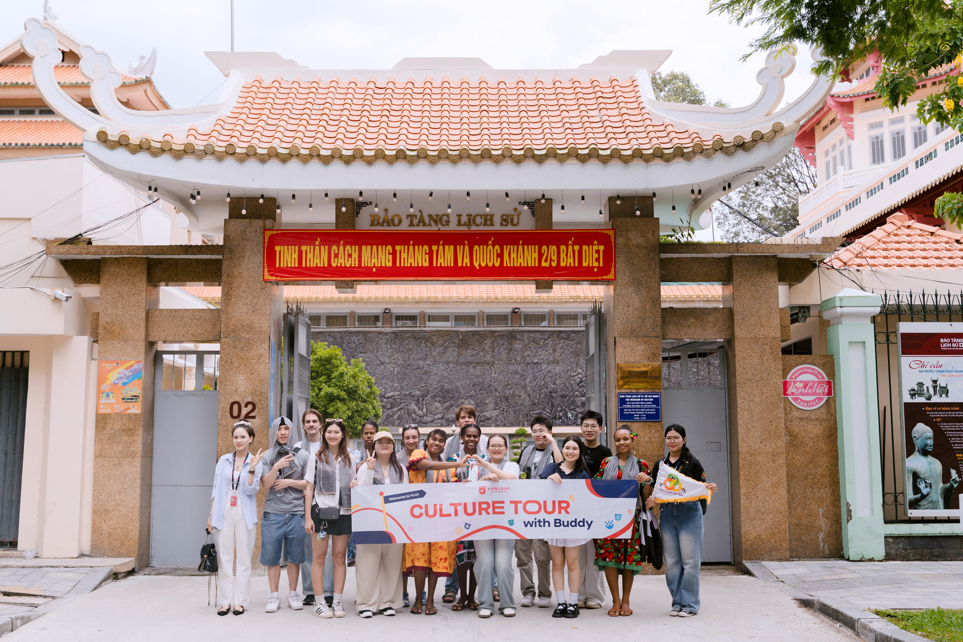 Hoạt động “Culture Tour with Buddy” diễn ra ngày 14/9/2025 đã đưa sinh viên đến từ Pháp, Phần Lan, Indonesia và Vanuatu trải nghiệm nhịp sống và các di tích văn hóa - lịch sử tại TP. Hồ Chí Minh. Với sự đồng hành của đội Buddy, hành trình dừng chân tại những địa điểm tiêu biểu: Dinh Độc Lập gợi mở những trang sử hào hùng của dân tộc; nghệ thuật múa rối nước tái hiện không gian sinh hoạt nông nghiệp truyền thống; quán cà phê với hầm chứa vũ khí bí mật gắn liền ký ức thời chiến tạo nên trải nghiệm khó quên. Song song với hành trình khám phá, sinh viên quốc tế còn thưởng thức phở atiso, cà phê bơ và trà Việt Nam - những hương vị quen thuộc phản ánh nhịp sống Sài Gòn.