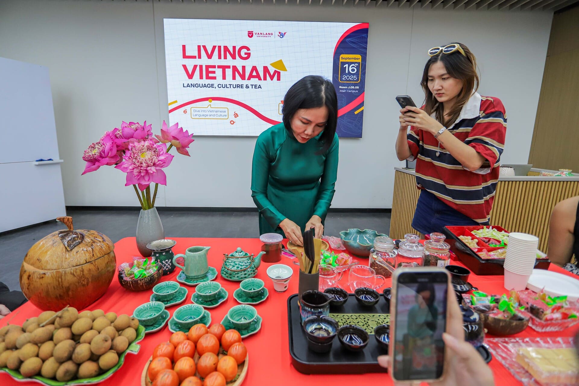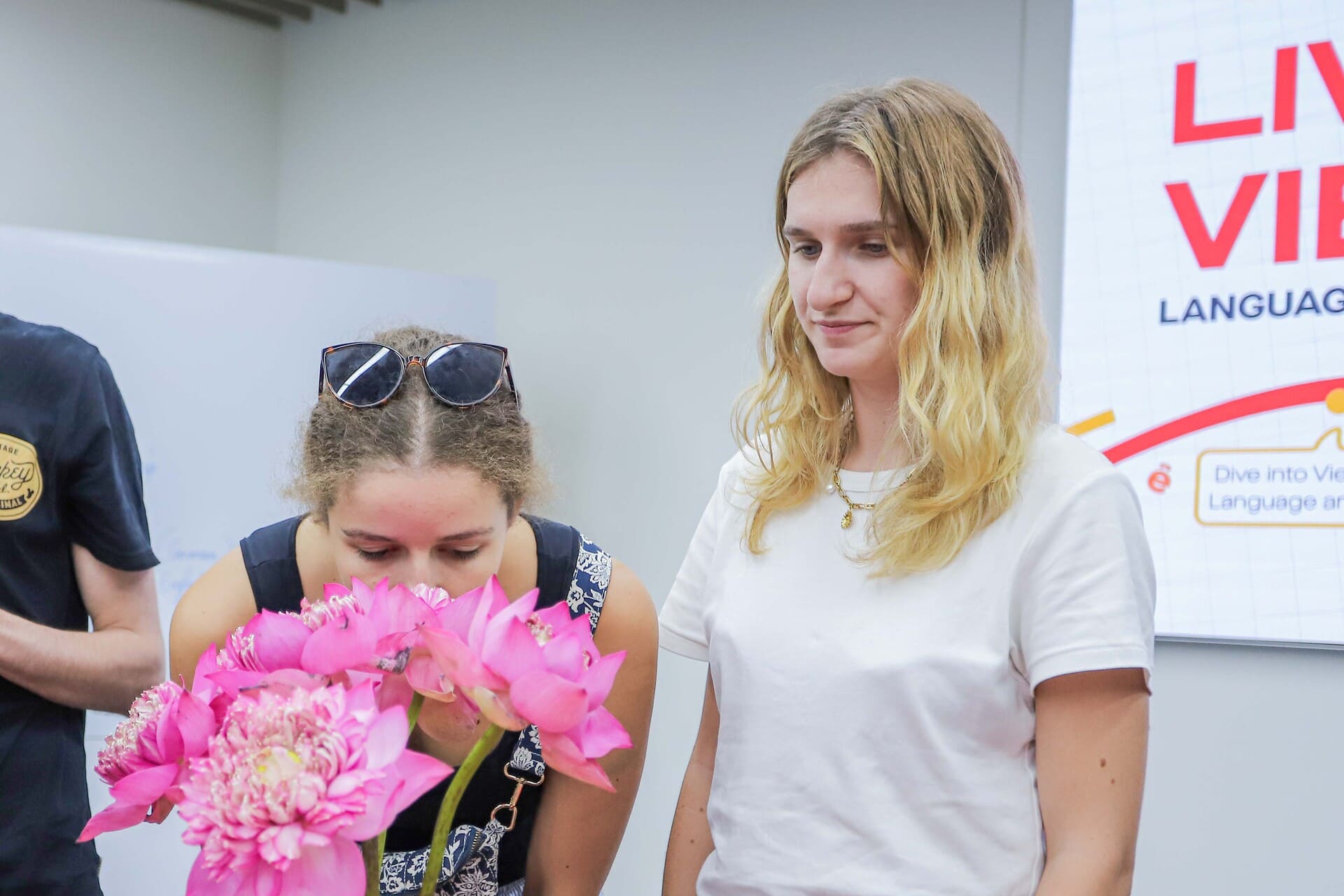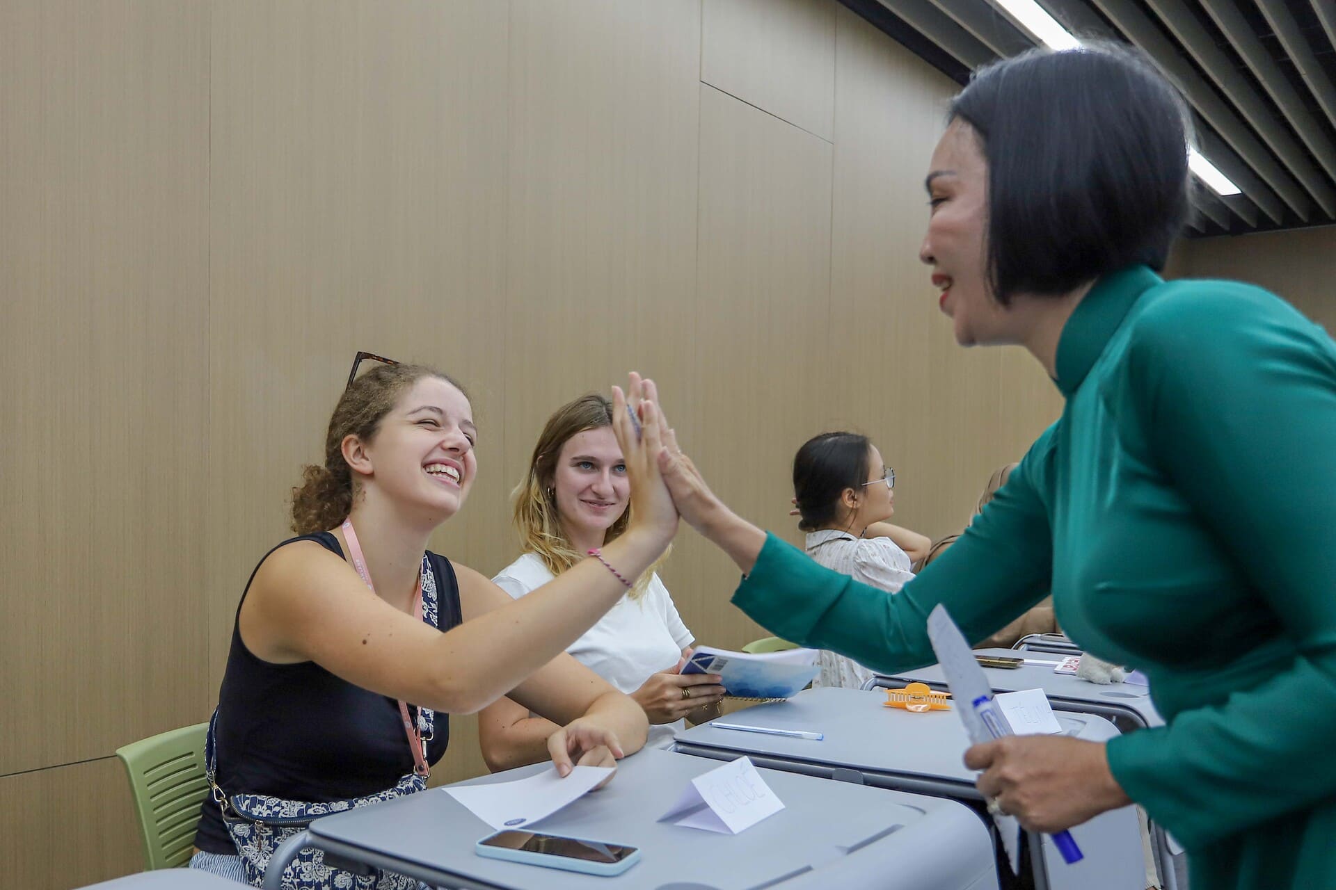 Hoạt động “Living Vietnam” gợi mở sự gần gũi trong đời sống thường nhật. Buổi học tiếng Việt tạo nên bầu không khí sôi nổi khi sinh viên tập làm quen bảng chữ cái, học cách giới thiệu bản thân, đếm số và thử “mặc cả” trong tình huống giả định. Những tiếng cười giòn giã, sự bỡ ngỡ nhưng đầy hứng thú đã khiến lớp học trở thành kỷ niệm đáng nhớ.