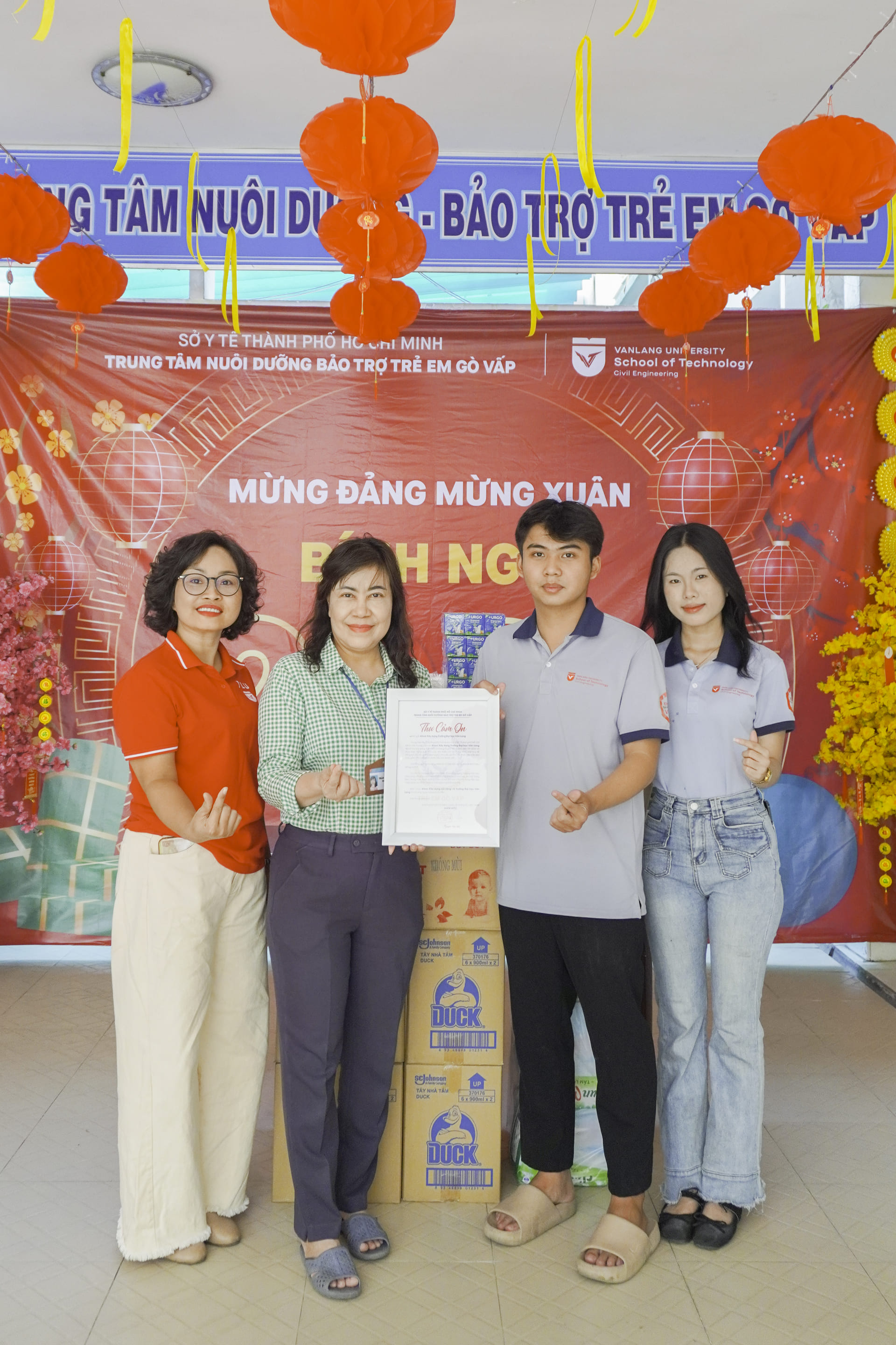 Bên cạnh hoạt động chuyên môn gắn với cộng đồng, sinh viên Văn Lang còn tích cực tham gia các chương trình thiện nguyện Xuân. Trong hành trình “Xuân sẻ chia” tại Trung tâm Nuôi dưỡng Bảo trợ Trẻ em Gò Vấp, giảng viên và sinh viên Khoa Xây dựng đã trao tặng nhiều phần quà thiết thực, đồng thời chỉnh trang không gian sinh hoạt cho các em nhỏ. Những cành mai vàng, câu đối đỏ được trang hoàng tỉ mỉ đã mang đến diện mạo mới ấm áp, rộn ràng sắc Xuân cho mái ấm.