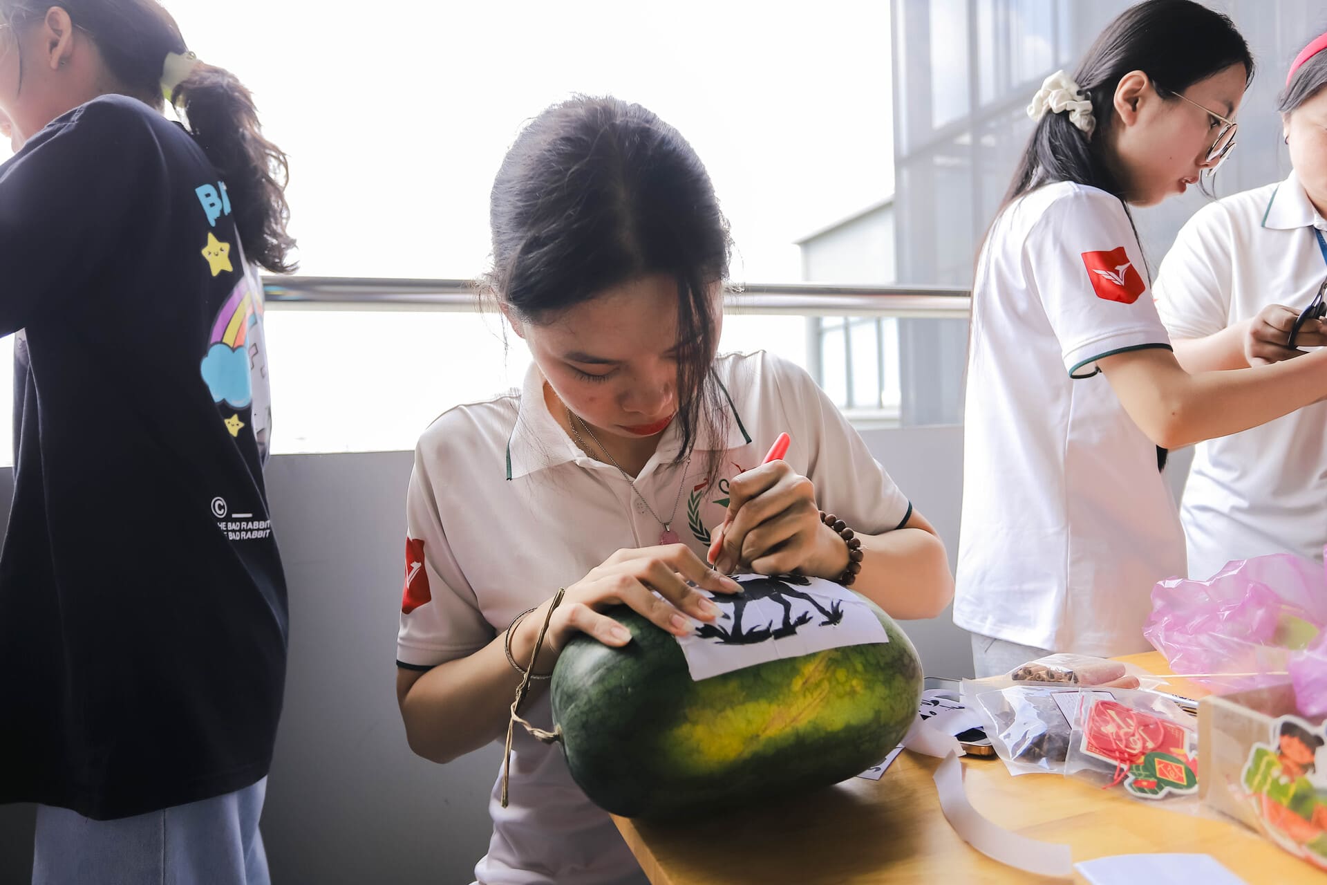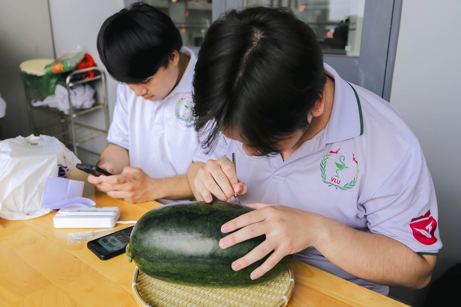 Ở lĩnh vực sáng tạo nghệ thuật ứng dụng, sinh viên Khoa Dược cũng góp phần làm phong phú không khí Tết học đường qua Cuộc thi “Trang trí dưa hấu mừng Xuân Bính Ngọ 2026” do Đoàn Khoa tổ chức. Những quả dưa hấu được khắc tỉa công phu, mang họa tiết và thông điệp chúc Xuân truyền thống, thể hiện sự khéo léo và tinh thần sáng tạo của sinh viên, đồng thời lan tỏa nét đẹp văn hóa Tết Việt trong môi trường đại học.